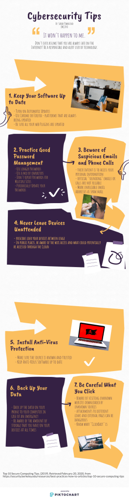 I organized this Piktochart with easy to follow tips about how you can better practice cybersecurity and safety when using the Internet. The tips that I included are as follows: keep your software up to date, practice good password management, beware of suspicious emails and phone calls, never leave devices unattended, install anti-virus protection, back up your data, and be careful what you click. While putting these tips into practice cannot insure a 100% chance of complete Internet safety, they will increase your chances of a positive Internet experience, whether it be on your mobile, laptop, or desktop device(s).